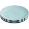 This set of four 11in plates is rendered in a subtle blue glaze and decorated with embossed concentric circles that attract the eye towards the center of the dish; accentuating the appetizing appeal of whatever you choose to serve on it.